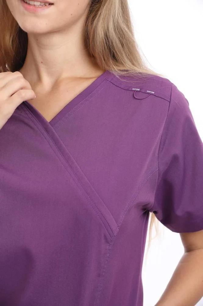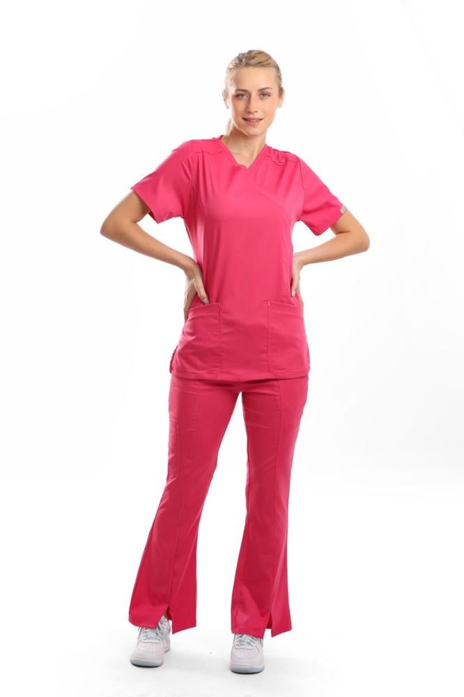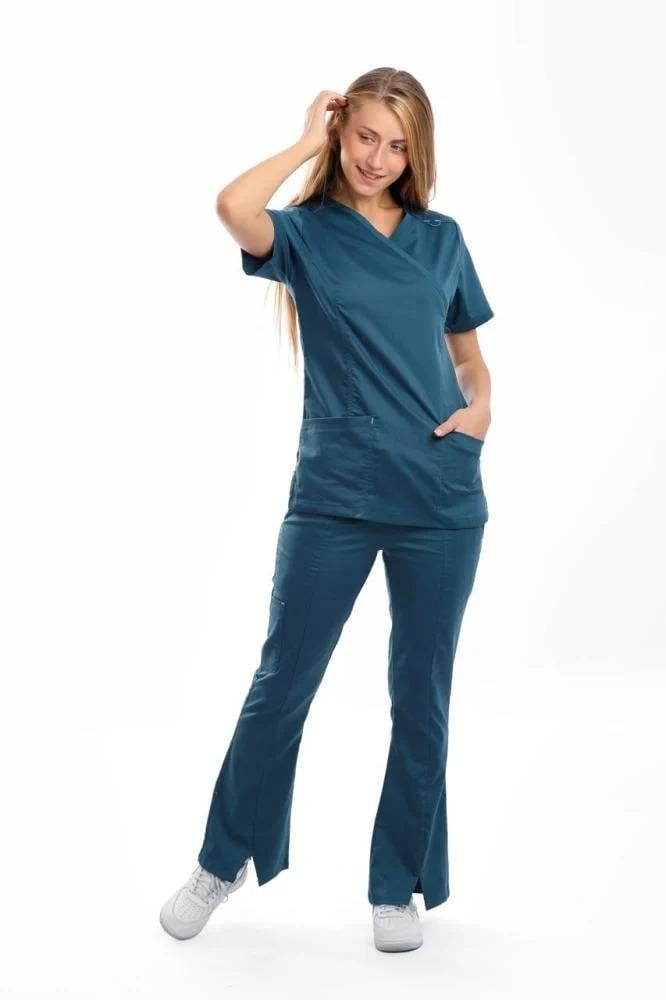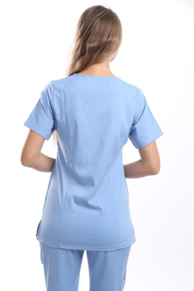 Top: V-neck shirt with short sleeves, two front pockets, and side slits at the waist