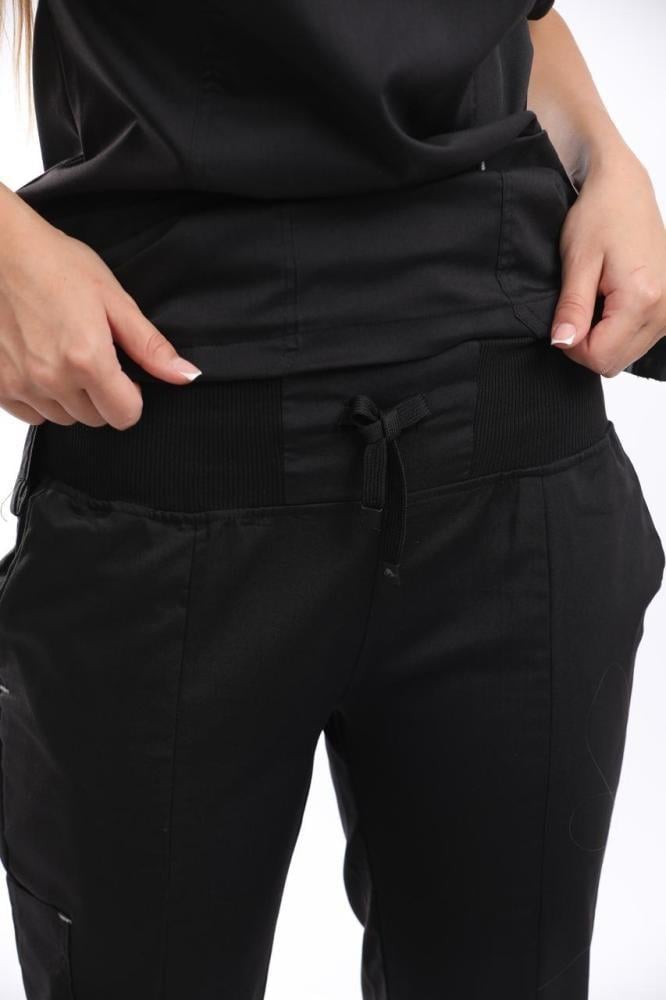 Pants: Wide-leg pants with an elastic waistband and drawstrings. They feature front pockets, a back pocket, a side pocket at the knee, and a front slit at the leg.