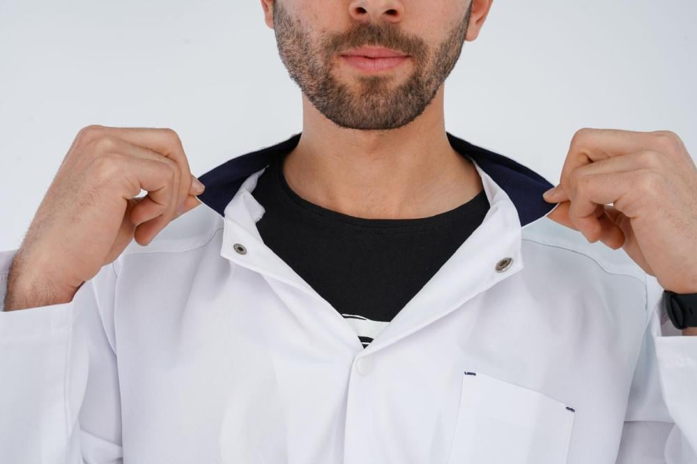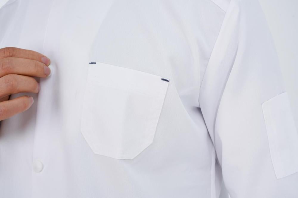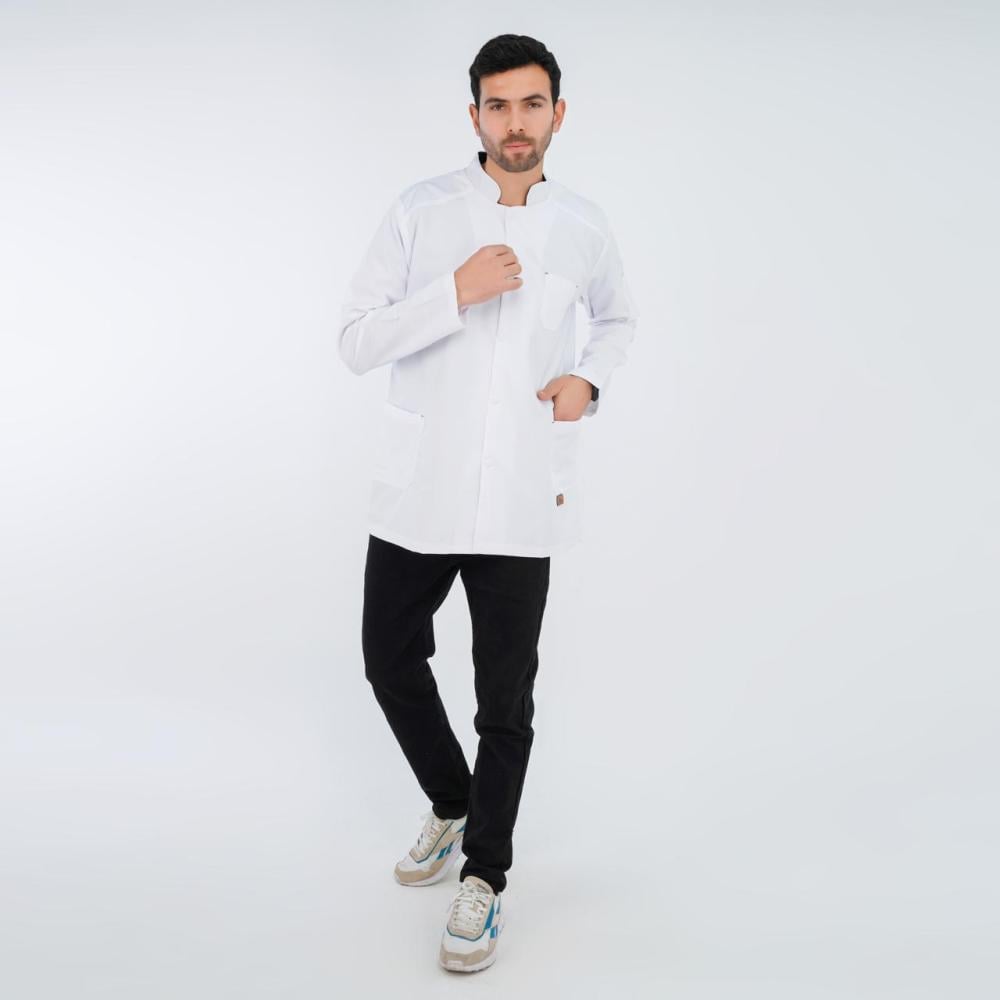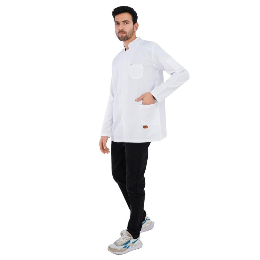 Features: Anti-shrink coat featuring half collar, long sleeves, front pockets, chest pocket, front snap buttons, and side slit